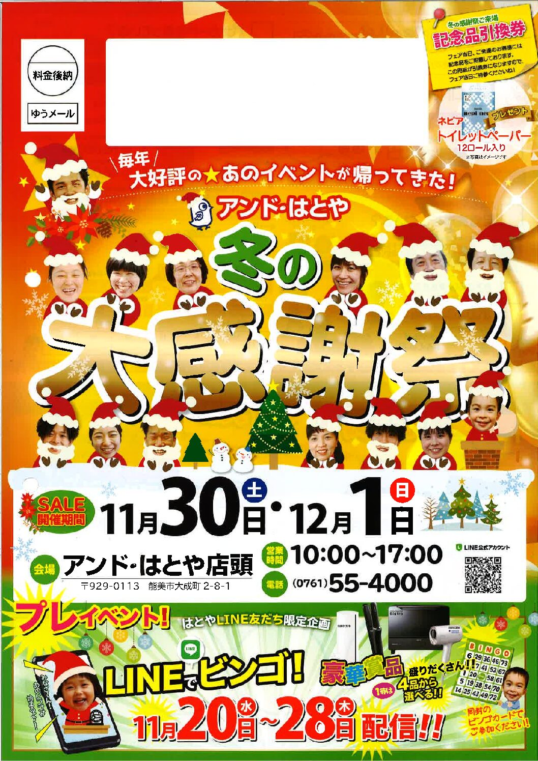 2024年11月30日(土)~12月1日(日) 冬の大感謝祭 2024/11/23 イベント 2024年11月30日(土)~12月1日(日) 冬の大感謝祭 11月11日(月)~14日(木) 招待状(ビンゴカード同封)配布 11月12日(火) ...